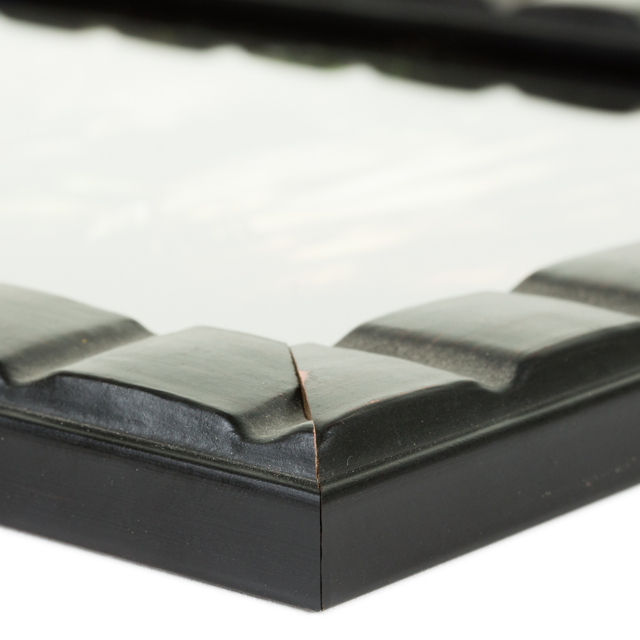 Sophisticated and elegant. The Mosaic picture frame is constructed from solid wood with a quality composite wrap. The raised profile with distinct tile pattern features a brushed Erie Black finish. Light brush strokes with maroon undertones heightens the antique qualities. Elevate your print display with a Smooth White mat. Make a fashionable statement with the Erie Black Mosaic picture frame.